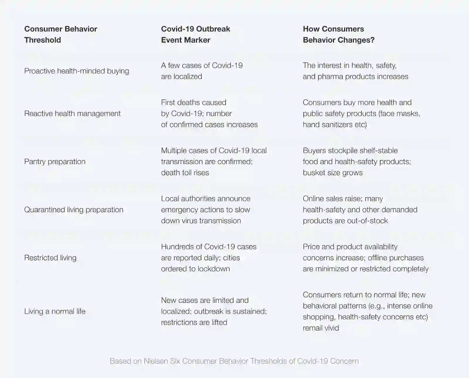 Nielsen consumer behavior thresholds give a good understanding of how shoppers react to the pandemic. Moreover, it can shed light on the post-COVID consumer behavior trends as many patterns will remain relevant even after the crisis is over.