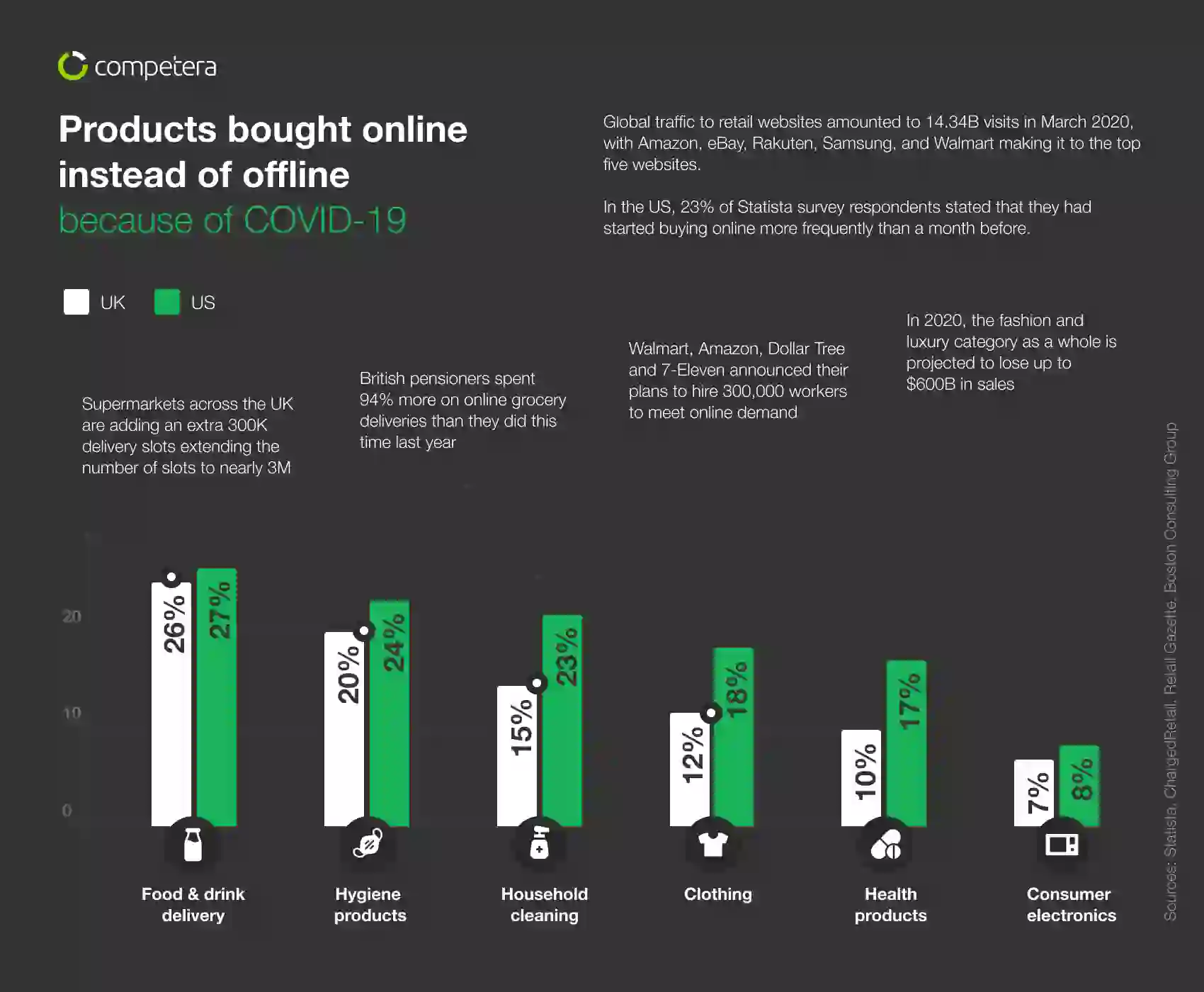 For example, in the US and UK, online demand increased primarily for grocery, hygiene products, household cleaning goods, clothing, health products, and consumer electronics. The infographic below shows the online-favorite categories in these countries in April and May 2020.