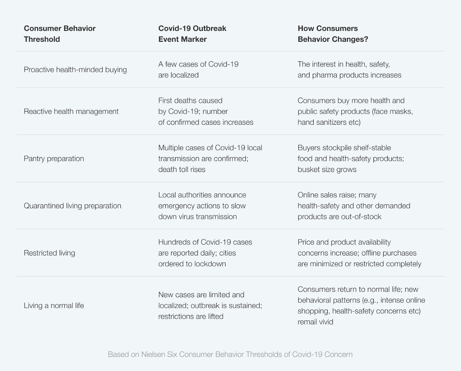 Emerging consumer behavior patterns force retailers to change conventional approaches to business. The impact of Covid-19 outbreak is not the same across national markets. Based on consumer data collected in countries affected first, Nielsen analysts developed the matrix of Six Consumer Behavior Thresholds of Covid-19 Concern.