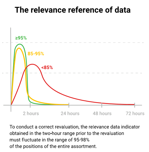 In order to conduct a correct reassessment, the fresh data indicator should fluctuate in a range of 95-98% of the positions of the entire assortment. In our example, out of all of the matched items, up to 147 thousand pieces of data should be delivered in a two-hour range before repricing. This quantity is an indicator of the relevancy of the prices.